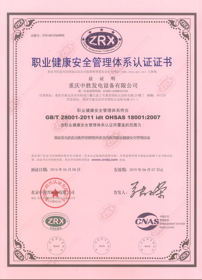职业健康安全管理体系认证证书