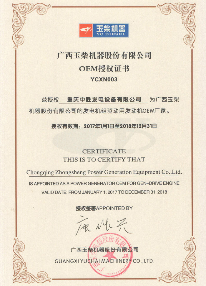 广西玉柴授权证书
