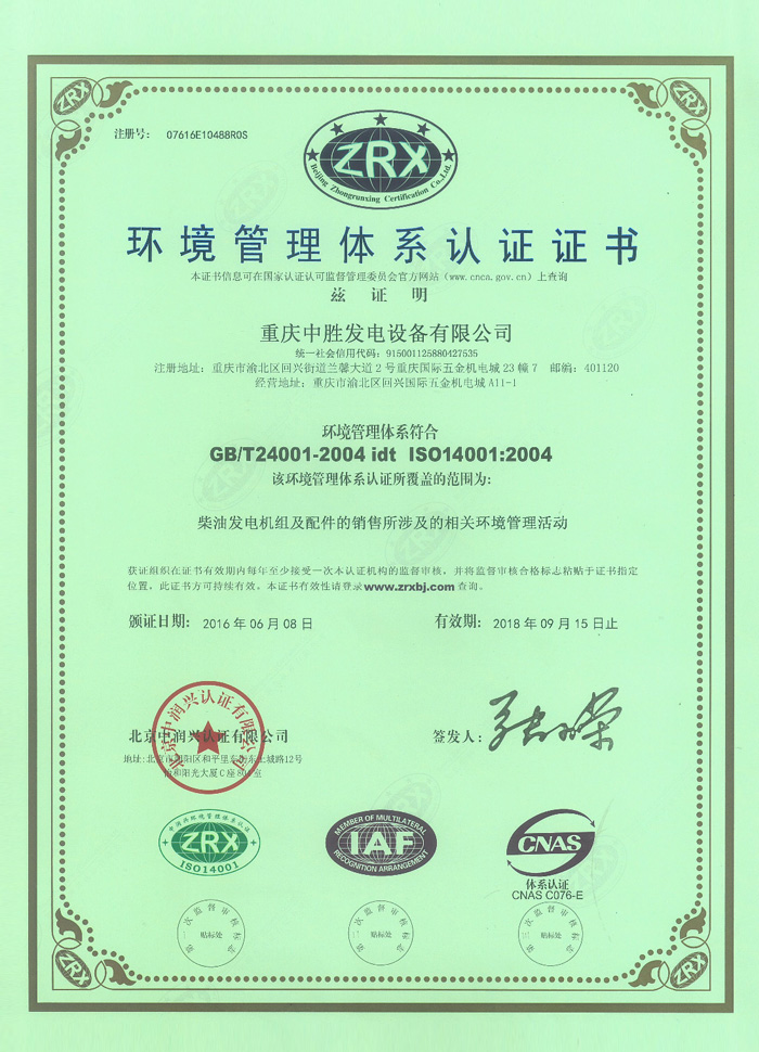 环境管理体系认证证书
